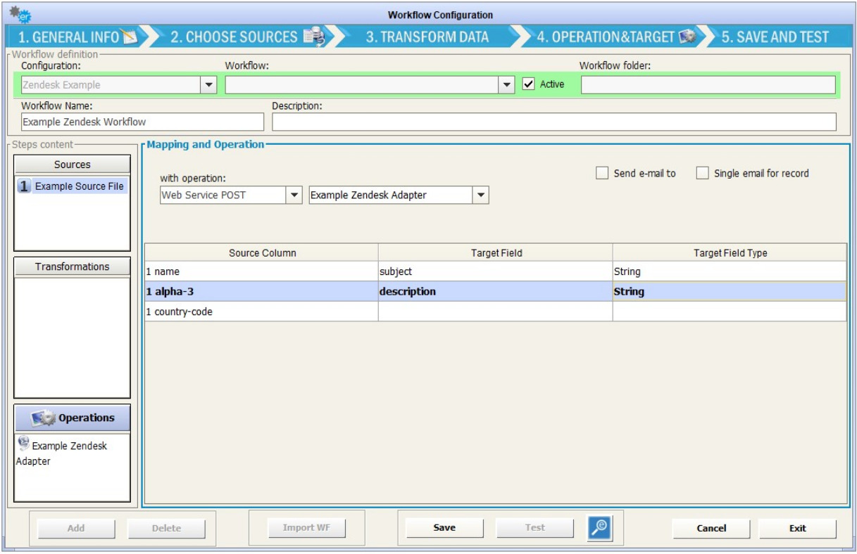 The adapter can now be used as a target endpoint when mapping data in a workflow. To select the adapter as a target, select “Web Service POST” as the operation and select your Zendesk adapter. A mapping table will appear, allowing the source fields to be mapped to relevant target fields for creating Zendesk tickets.