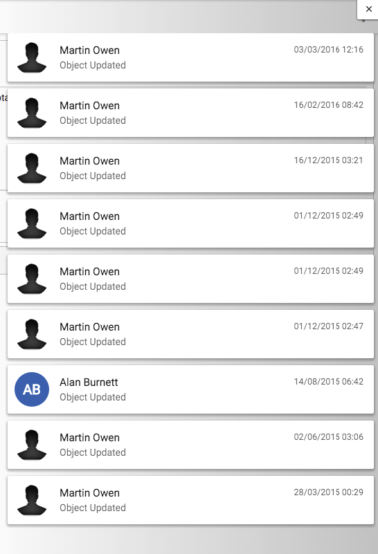 The activity log includes a list of changes made to the object including details of who made the changes and when.