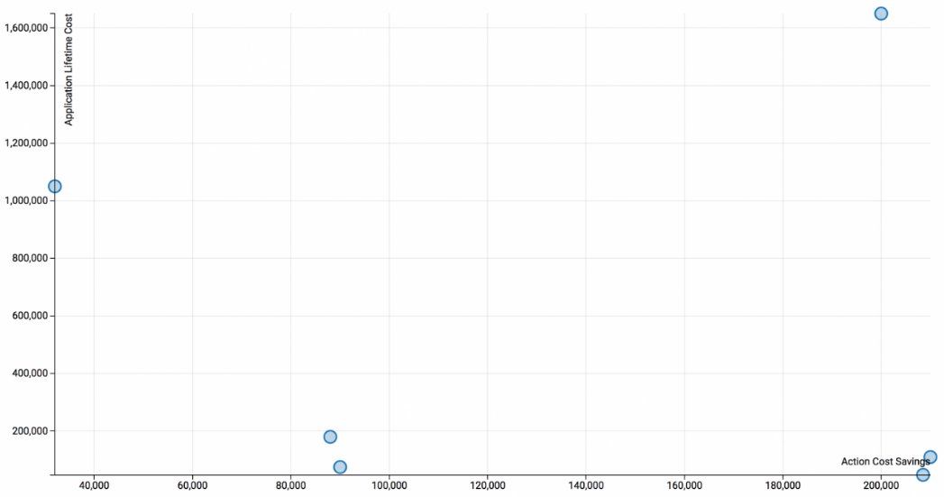 The purpose of a scatter chart is to show the possibility of a correlation between the two selected attributes. With such a small sample of six Application components, it is difficult to draw any conclusions. A straight line connecting the objects would suggest a high probability that the attribute values were somehow related.