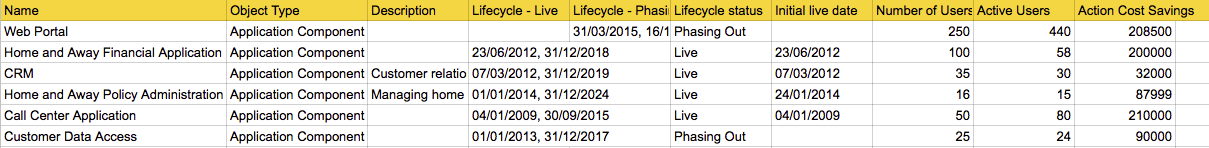 We can also see for a single application component, its live and sunset dates in different lanes, so we can compare.