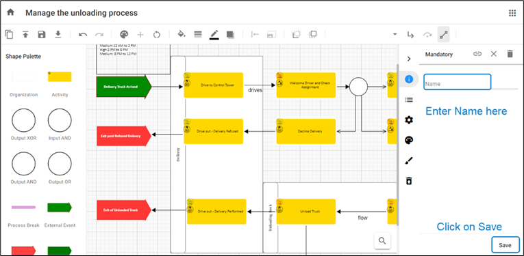 To show the flow between the shapes, Association Names can be placed on Association Links.