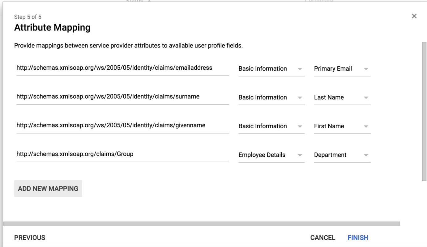 Using the "ADD NEW MAPPING" button add attribute mappings for the following 4 attributes
