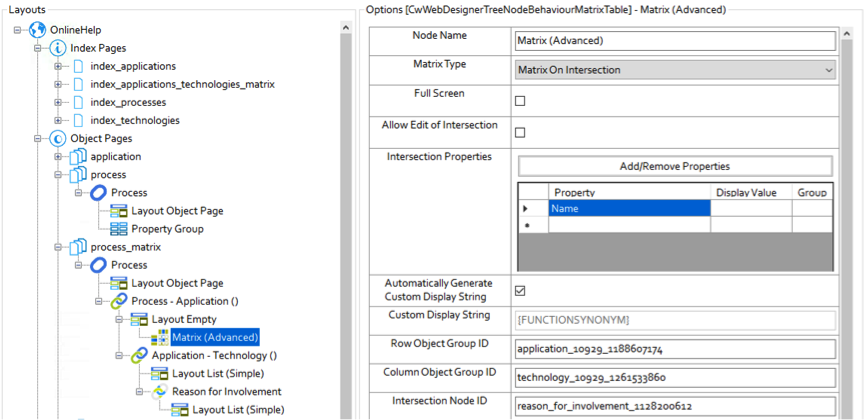 6. The Matrix (Advanced) behavior can now have its Intersection Properties added, and the Row Object Group ID and Column Object Group ID updated from           the Application and Technology object types;