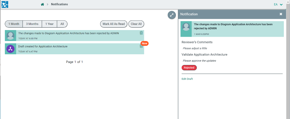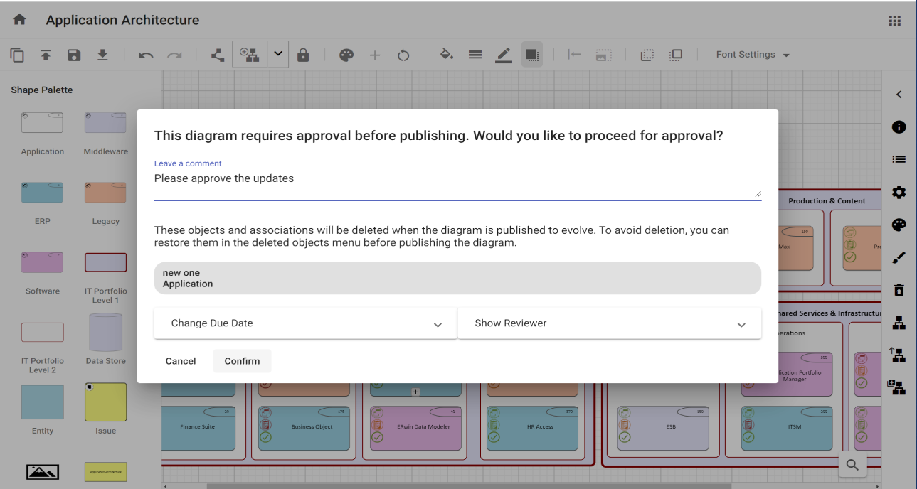 Bringing the ability to review and approve the publication of diagrams to Evolve. Web Modeler is now able to utilize the built-in approval workflow. Using this workflow, it is possible to assign roles that will be responsible for assessing, giving feedback and publishing diagrams.