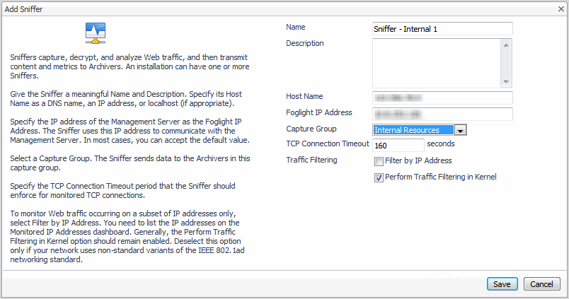 Traffic Capture—configure the software components and assign them to capture groups. Set options to resolve gaps in the data captured by default, decrypt secure traffic, and capture additional information that makes the data more meaningful.
