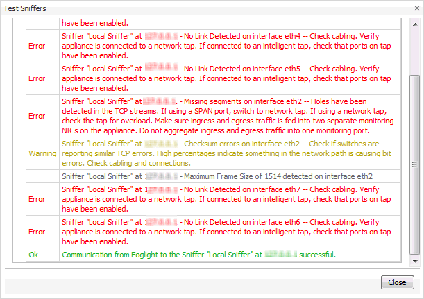 For any other status, review the Details column to understand what issues need to be addressed and click Close. Edit the sniffer’s definition to correct the issues. |