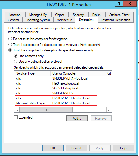 In Active Directory Users and Computers, find the Hyper-V server and go to properties. Then, find Delegation tab and add CIFS and Microsoft Virtual System Migration Service.