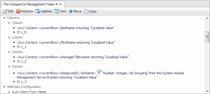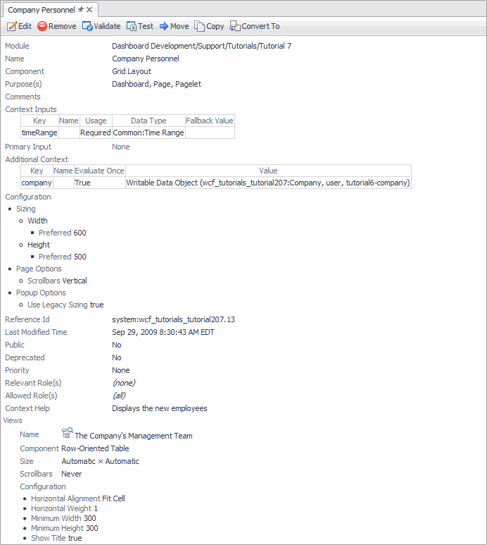 In most designs, the table appears in a grid that holds the table along with other related views. We place the table in such a grid to complete the tutorial. Creating a dashboard is not covered in previous tutorials, so all that needs explaining here is the context entry. A structure is needed to hold the list of managers. By creating an instance of a company object in the dashboard, we also create a manager array that is initially null. Nonetheless, we can get a reference to it and create an empty list of managers the first time the Add Manager function is called. After that, manager entries can populate the list.
