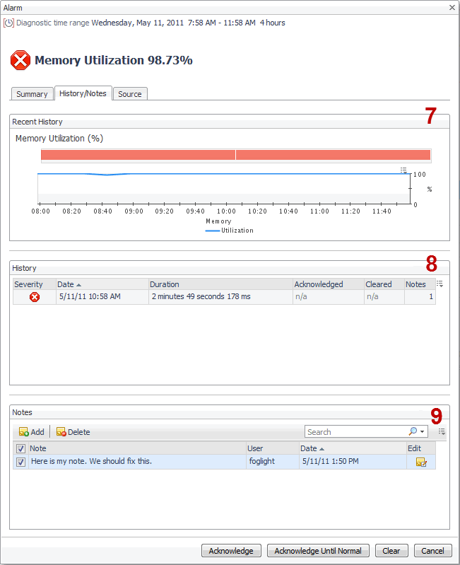 The Recent History view on the History/Notes tab is the view to which the Large Detail View property is mapped. It has similar height restrictions to the Small Detail View (130 px, see Step 3), but can be wider. This can be the same view as the Small Detail View, or a different view containing alarm metrics. The contents of the selected view should be compatible with the title (Recent History). In cases where the small view is flexible then the view to which the small view is mapped can be mapped to the large detail view as well. The large view should also be compatible with the title (Recent History).