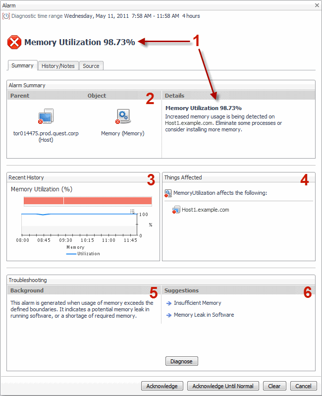 The following diagrams indicate the components of the Alarm dialog box that need to be configured in the alarm association. Use the guidelines provided below when configuring these components in an alarm association.