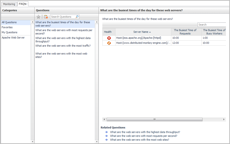 You can access instant answers to questions relating to your web servers, such as during which time periods peak traffic occurs, or which web servers have the most traffic. These frequently asked questions appear on the FAQts tab, or alternatively in the FAQts mini-viewer, located in the bottom-left corner of the Apache Web Server Monitoring dashboard.
