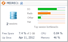 Use the Oracle Tile to gather performance information about the state of Oracle® database transactions monitored by Foglight for Oracle. This tile displays the current top used resources from the list below.