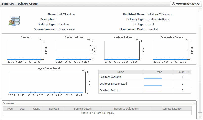 In your monitored environment, a Delivery Group is a collection of desktops and applications that can be accessed by specific end users. You can review the performance of individual Delivery Groups in the Summary - Delivery Group view. This view allows you to review general information about a selected delivery group along with performance trends in session counts, connected users, machine and connection failures. Use this view to review the general trends in the overall performance of monitored Delivery Groups and to look for any indicators that suggest potential bottlenecks. For example, an unusually high number of connection failures can affect the end-user experience and should be investigated.