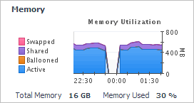 The Swapped line in the Memory Utilization chart shows the amount of memory that is stored in disk swap space, during the selected time period. Shared displays the amount of the virtual machine memory that is freed up due to transparent page sharing. Ballooned represents he amount of physical memory that is actively being used by the VMware Memory Control Driver to allow the guest OS to selectively swap memory. Active shows the amount of the available memory that the virtual center uses during the selected time period. The Total Memory value below the chart is the total amount of memory available to the selected virtual center. Memory Used shows the percentage of the memory resources the selected virtual center currently uses | ||