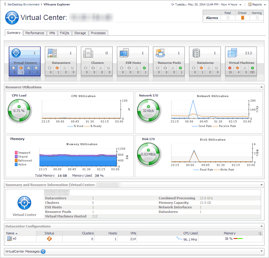 You can monitor the performance of these elements when you select the vSphere tile on the XenDesktop Environment dashboard. The information appearing in the vSphere Infrastructure Quick View can help you discover sources of performance degradation such as spikes in CPU, memory and disk usage, and to reallocate resources where they are most needed.