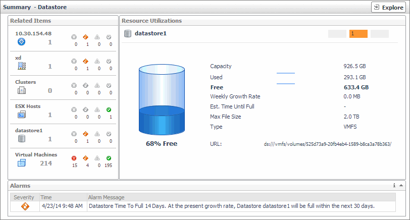 A datastore represents a storage location for virtual machine files. You can review the performance of monitored datastores using the Summary - Datastore view, appearing on the right in the vSphere Infrastructure Quick View, when you select a datastore in the vSphere Infrastructure view on the left. This view displays the overall resource utilization statistics and the amounts of system resource consumption for a physical datastore. This information can help you identify prevent potential bottlenecks. For example, a high amount of used space typically calls for reallocation of storage resources, as required.