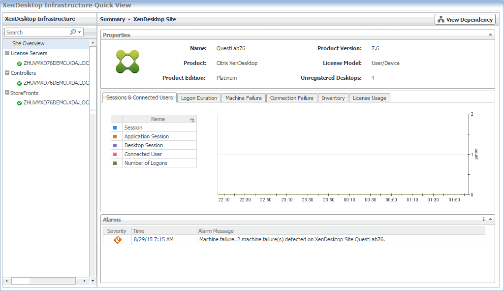 A XenDesktop Site represents your monitored XenDesktop® environment, consisting of Delivery Controllers, virtual desktops, and other associated components. The Summary - XenDesktop Site view allows you to review general information about the monitored XenDesktop site along with performance trends in session counts, logon duration, machine and connection failures. Use this view to review the general trends in the overall performance of your monitored XenDesktop site and to look for any indicators that suggest potential bottlenecks. For example, an unusually high number of connection errors can affect the end-user experience and should be investigated.