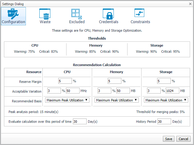 Thresholds. Provides the values of a resource metric that define the Warning and Critical levels (for CPU, memory, and storage). |