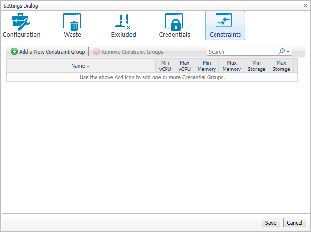 This tab is available in VMware environment. The Constraints tab allows you to set custom thresholds for select objects in the environment. These recommendations are displayed in the Optimizer tab > VM Configuration/ CPU/ Memory/ Storage views > Modify Recommendation column. Use this tab to add, edit, and remove constraints groups.