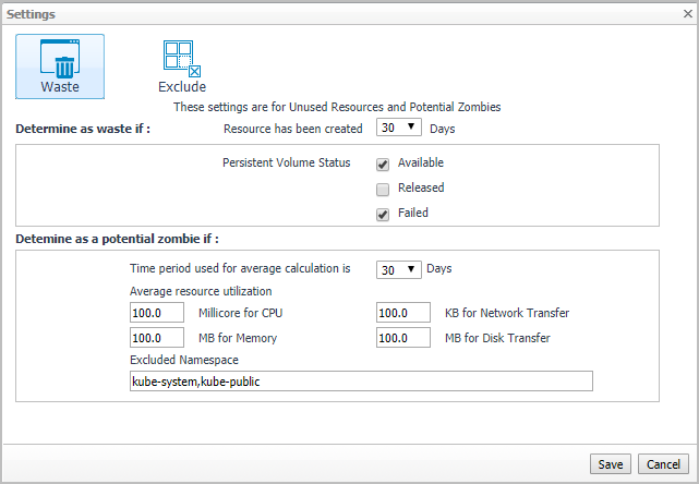 The Waste tab allows you to configure the settings for determining resources wasted in your environment. These include unused resources and potential zombie Pod controllers.