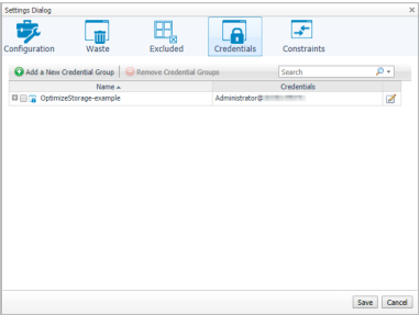This tab is available in VMware environment. The Credentials tab allows you to add, edit, and remove credentials groups. This tab is only for the Storage rightsizer.