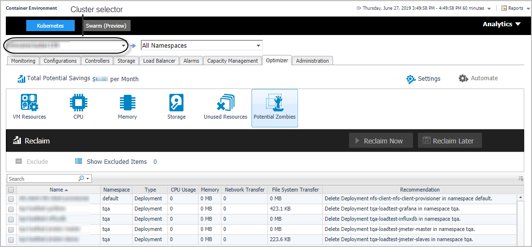 NOTE: The Reclaim Now and Reclaim Later buttons are enabled only after selecting a checkbox from the table. Currently, the two buttons only function for VM Resources, CPU, and Memory when a VMware cluster is selected. The Automate, Reclaim Now, and Reclaim Later buttons are displayed only when a VMware cluster is selected. |