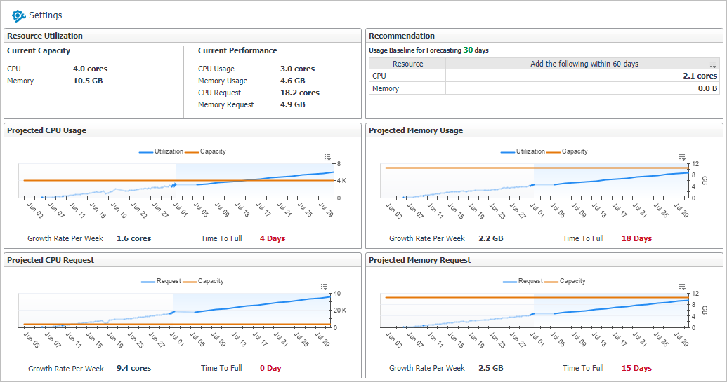 Time to Full: how many days the resource usage/request will reach the capacity. |
