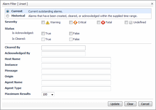 For example, you can filter the list of alarms to show only Current or Historical alarms. Select Current to shows all outstanding alarms. This is essentially the current outstanding set of alarms that need to be addressed. Use Current if you want to see what is immediately noteworthy. In contrast to Current, Historical shows all alarms that fired during a certain interval, regardless of whether they are active or cleared. Use Historical if you want to see what is happening in your monitored environment during a specific time range.