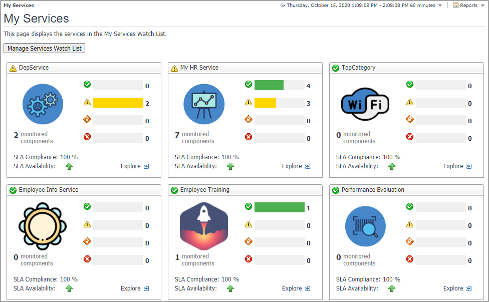 By default, no services are listed in the My Services dashboard. This is by design: it gives you the opportunity to customize the My Services dashboard to suit your needs. Select the set of services that you want to monitor so that they appear in this dashboard.