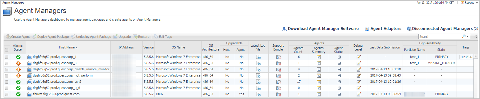 There are two dashboards that allow you to deploy agent packages and create agent instances: Agent Status and Agent Managers. To access the Agent Managers dashboard, from the navigation panel, click Dashboards > Administration > Agents > Agent Managers.
