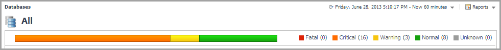 The Database Alarms pane shows the numbers alarms, by the severity level (Fatal, Critical, Warning, Normal, and Unknown). Use it as a starting point to quickly identify the sources of problems within your database infrastructure.