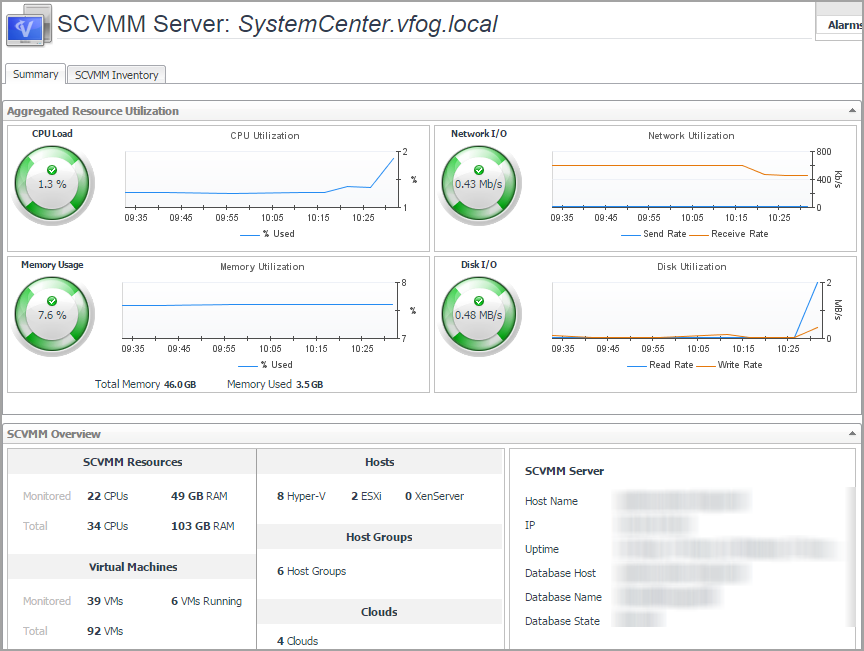 SCVMM Server. Shows the state of the selected SCVMM Server, including Host Name, IP, Uptime, Database Host, Database Name, and Database State.