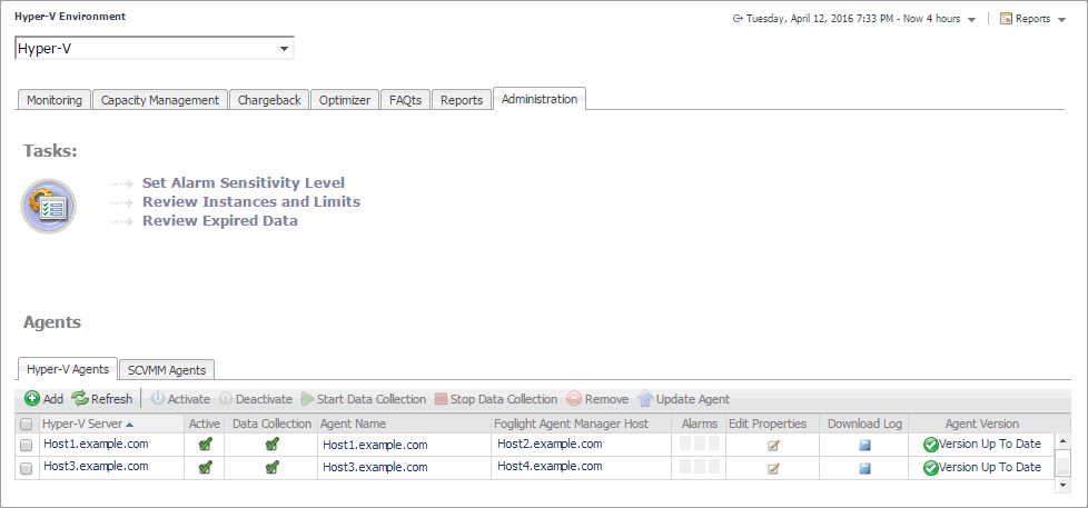 On the Hyper-V Environment dashboard that appears in the display area, click the Administration tab. |