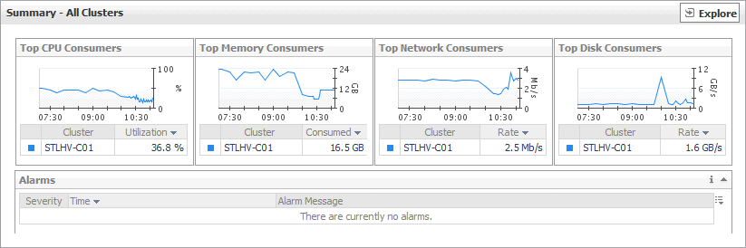 The Summary - All Clusters view displays overall resource utilization information for a group of clusters, and shows the elements that consume the highest amount of system resources.