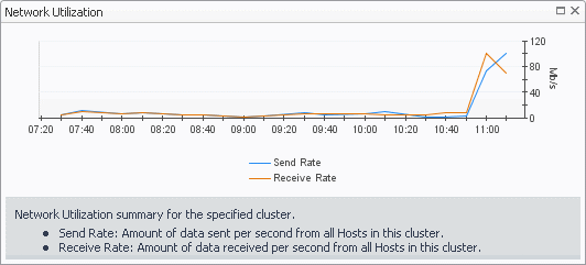 Network Utilization, Receive Rate. The rate at which all servers that belong to the selected cluster receive data from the network, during the selected time period.