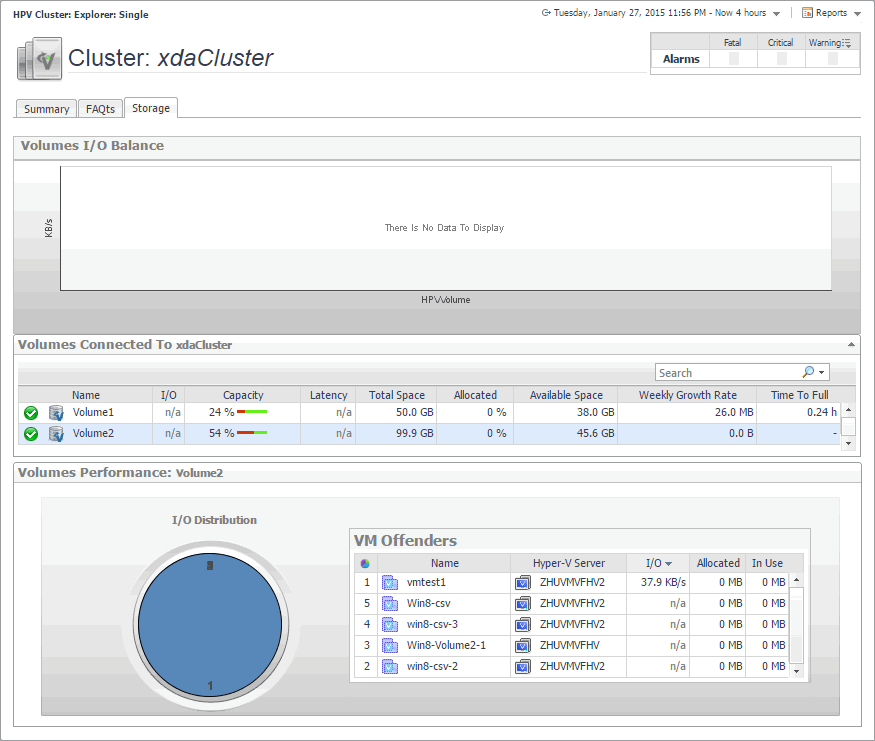 The Hyper-V Explorer Storage tab displays combination of embedded views displaying disk volumes associated with the selected cluster. It identifies the virtual machines that spend the highest amounts of disk resources. Use this tab to find out more about the overall consumption of disk resources for a given cluster. The information provided on this tab can help you prevent potential bottlenecks by reallocating disk resources where they are most needed.