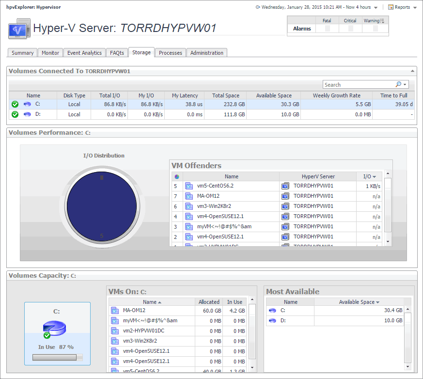 The Hyper-V Explorer Storage tab displays combination of embedded views displaying disk volumes associated with a selected virtual machine. It identifies the virtual machines that spend the highest amounts of disk resources. Use this tab to find out more about the overall consumption of disk resources for a given virtual machine. The information provided on this tab can help you prevent potential bottlenecks by reallocating disk resources where they are most needed.