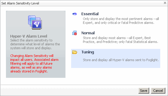 In the Set Alarm Sensitivity Level dialog box, select the desired sensitivity level: Essential, Normal, or Tuning. |