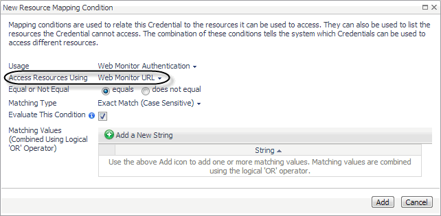 In the New Resource Mapping Condition dialog box, click Usage, and select Web Monitor Authentication from the popup that appears. |