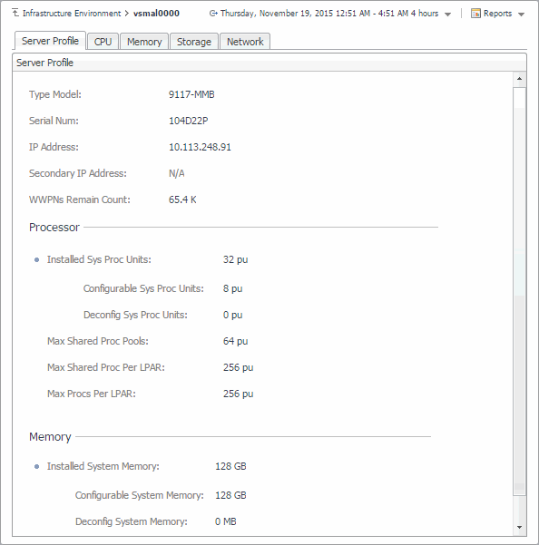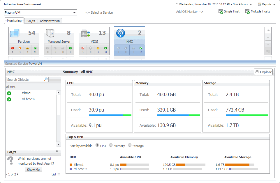 You can monitor the performance of PowerVM® servers, PowerVM partitions, and PowerVM Virtual I/O servers on the Monitoring tab of the Infrastructure Environment dashboard. The information appearing on this dashboard can tell you how well the selected monitored objects are performing given the current workload, and to discover potential resource-level issues, typically indicated by higher than usual processor, memory, and disk storage usage. This allows you to pro-actively reallocate resources where they are most needed, and to prevent service interruptions before they happen.