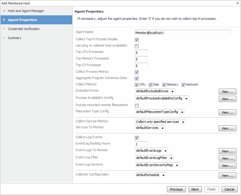 On the Agent Properties page, specify the properties of the monitoring agents. For complete information, see Creating agent instances. Click Next. |
