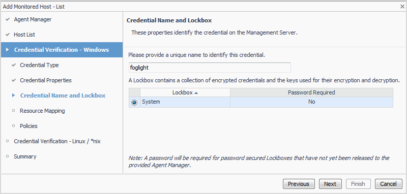 On the Credential Name and Lockbox page, provide a name to identify the credential, and select a lockbox in which you want to keep the credential. A lockbox can be used to group credentials for access and/or security. In smaller Foglight installations, using the default System lockbox should be sufficient. |