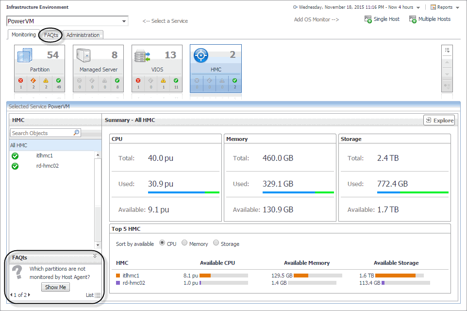 The bottom-left corner of the Monitoring tab allows you to navigate through commonly asked questions associated with the selected object type, and to review their answers. You can also review these questions using the FAQts tab. For more information, see Reviewing frequently asked questions.