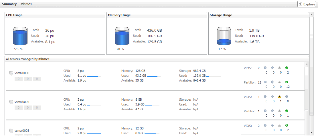 The managed server Summary view displays the resource utilization for the selected managed server. This view shows the levels of processor, memory, disk, and network usage. It also identifies the elements of your PowerVM infrastructure associated with the selected managed server, such as the HMC, VIOS, logical partitions, and others.