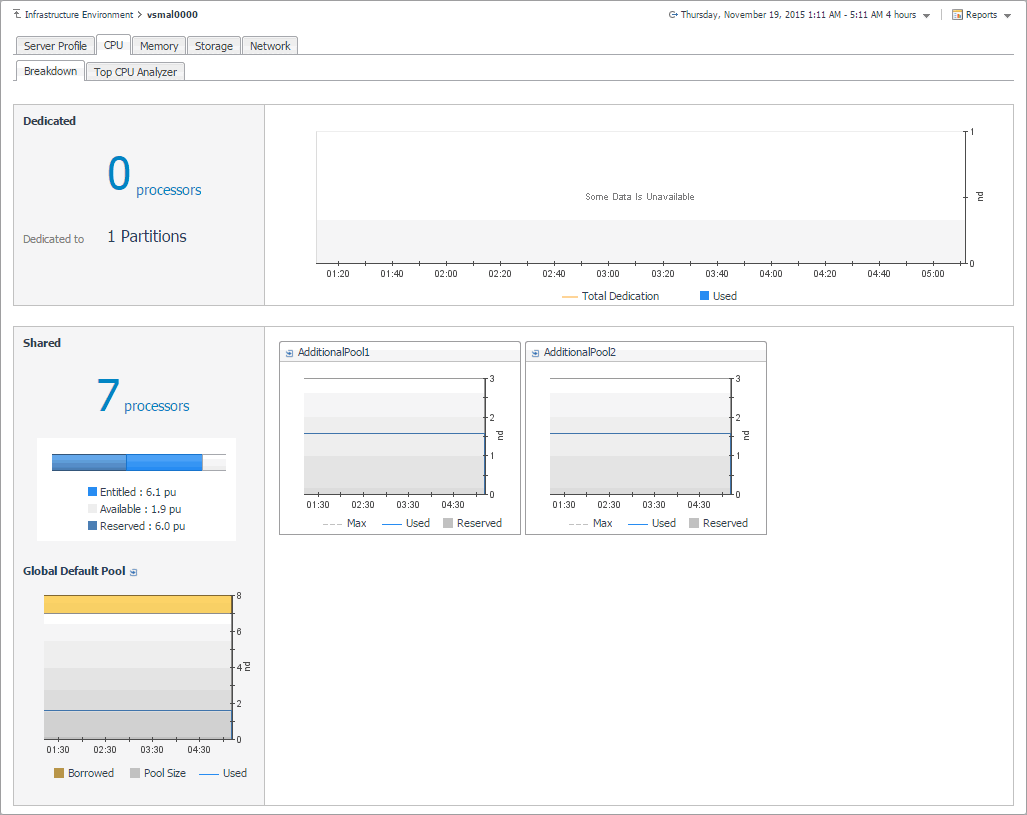 The Breakdown views on the CPU, Memory, and Storage tabs of the managed server details view, and on the Storage tab of the VIOS details view show the amount of processor, memory, and storage resources the selected managed server or PowerVM® VIOS uses from the Global Default Pool over the selected time range. Use this view to find out how the selected object uses the allocated resources, and if there are any patterns indicating their usage levels that may potentially compromise the stability of your infrastructure.