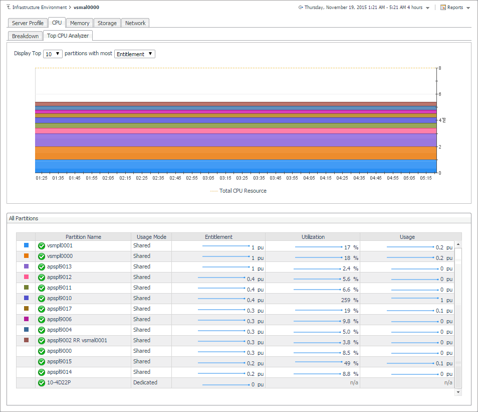 When Entitlement is selected, the Total CPU Resource areas in the graph represent the number of processing units allocated to the PowerVM partitions that are associated with the managed server. When Utilization is selected, the areas in the graph represent the percentage of the managed server processor resources allocated to the partitions that are associated with the server and in use over the selected time range. When Usage is selected, the areas in the graph represent the number of processing units allocated to the partitions associated with the managed server that are in use over the selected time range. | ||