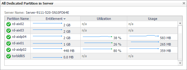 Click this link to display the All Dedicated Partitions in Server dialog box that lists all dedicated PowerVM partitions that belong to this PowerVM server, their entitlement, utilization, and usage. | |||