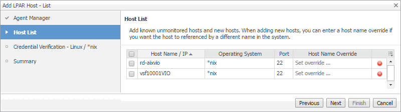 In the Add LPAR Host - List wizard, on the Host List page, review the list of VIOS or partition instances that you selected for monitoring. |