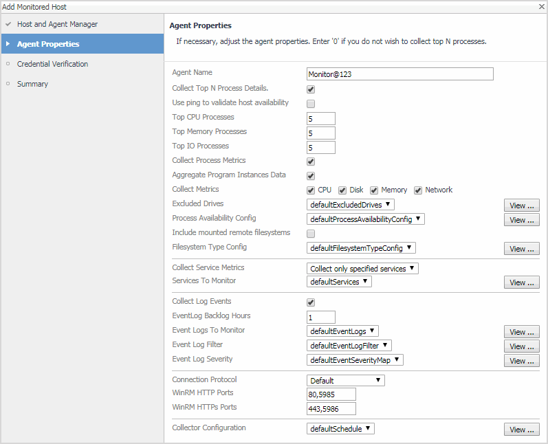 On the Agent Properties page, specify the properties of the monitoring agents. For complete information, see Creating agent instances. Click Next. |