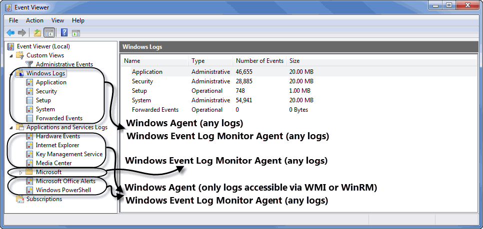 The Windows Event Log Monitor Agent collects information from Windows Event Log files. This agent expands the functionality of the Windows Agent, also included with Foglight for Infrastructure. However, while the Windows Agent can collect information only from Windows Logs and those Application and Service Logs that are accessible through WMI or WinRM, the Windows Event Log Monitor Agent can monitor both Windows Logs and any Application and Service Logs, including the Microsoft Application and Services Logs, available on some newer Microsoft Windows versions.